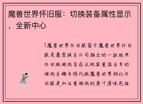 1. 魔兽世界怀旧服简介 魔兽世界怀旧服是暴雪娱乐公司推出的一款经典怀旧版游戏,旨在让玩家重温当年的游戏乐趣。与现代版魔兽世界相比,怀旧服更加注重游戏的原汁原味,包括游戏的难度、装备属性显示等方面。本文将重点介绍怀旧服中如何切换装备属性显示的方法。 2. 装备属性显示的重要性 在魔兽世界中,装备属性...